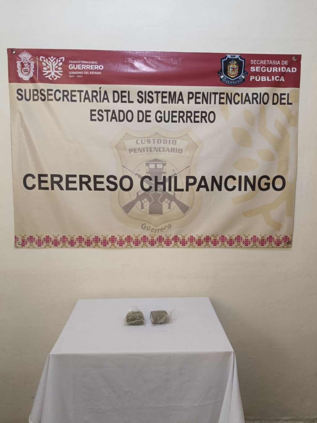 En un primer hecho, en el CERERESO (Centro de Readaptación y Reinserción Social) de Chilpancingo de los Bravo, el personal operativo aseguró un paquete con hierba verde, con características similares a la marihuana, con un peso aproximado de 101 gramos.
