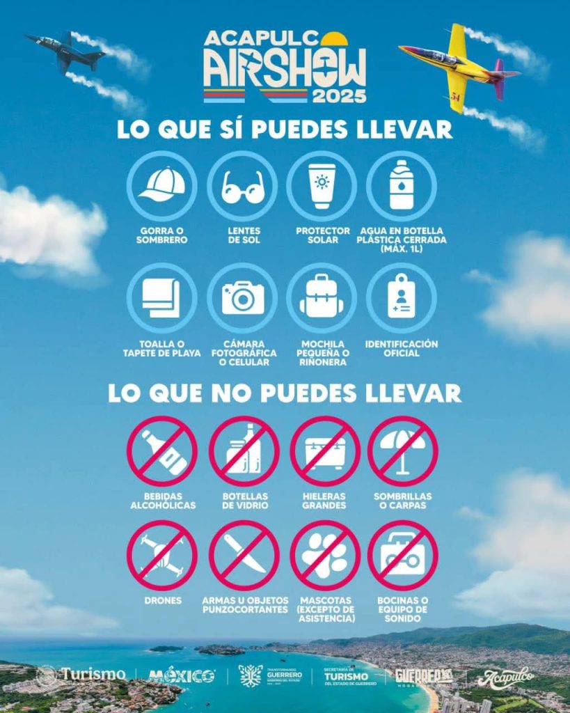 Para mantener un ambiente seguro y ordenado, se informó que no se permitirá el ingreso de: bebidas alcohólicas, botellas de vidrio, hieleras grandes, sombrillas o carpas, bocinas o equipo de sonido, drones, armas u objetos punzocortantes, mascotas -excepto animales de asistencia-.