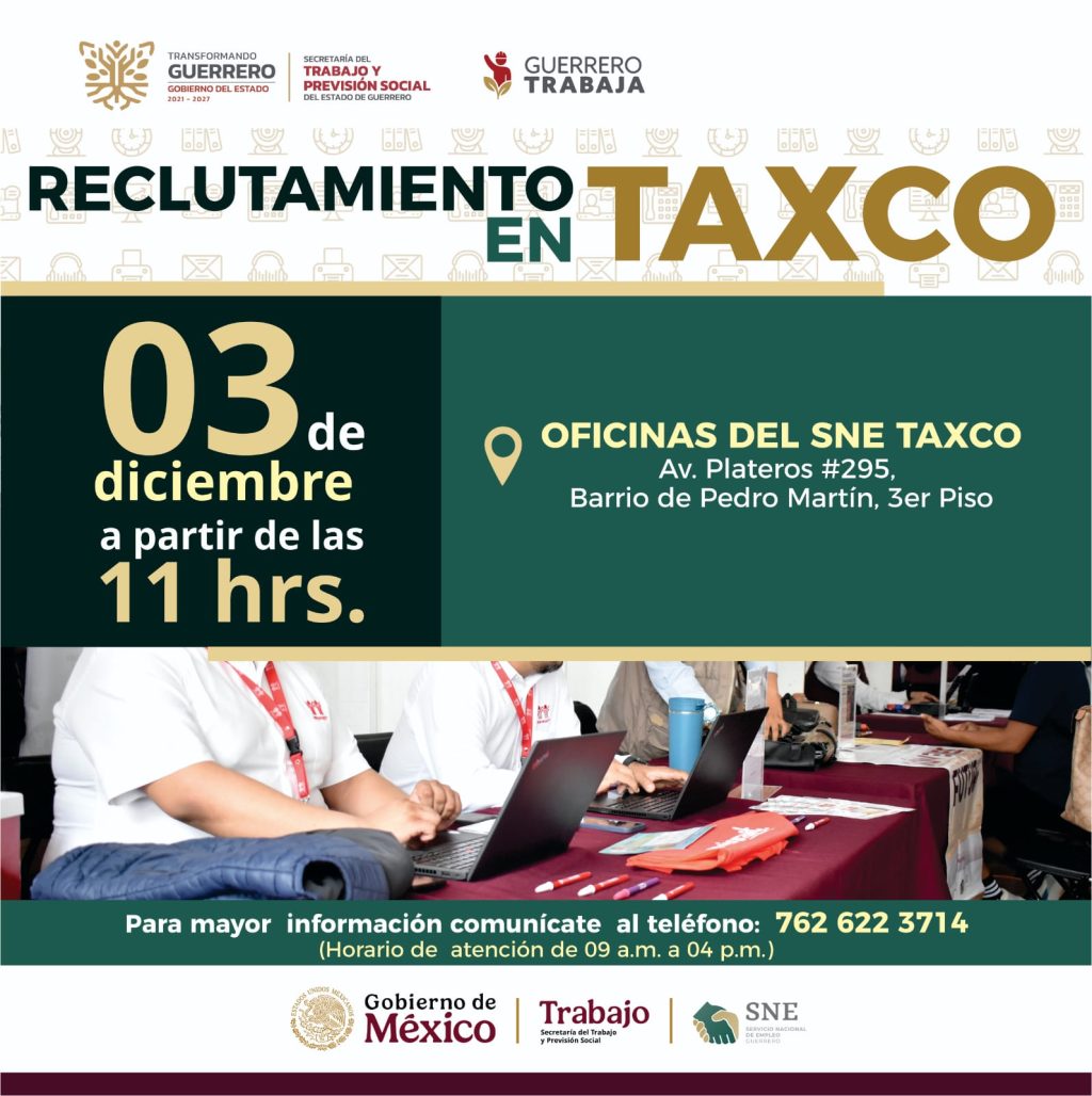 En Taxco, la jornada iniciará a las 11:00 horas en las oficinas del Servicio Nacional de Empleo (SNE), ubicadas en Avenida Plateros 295, Barrio Pedro Marín. Las personas interesadas pueden solicitar información al 762 622 3714.