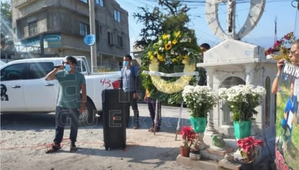 A las 10:30 horas, más de 30 normalistas de Ayotzinapa llegaron y colocaron una ofrenda floral en el sitio donde murió el joven la noche del 7 de marzo de 2024, presuntamente a manos de policías estatales.