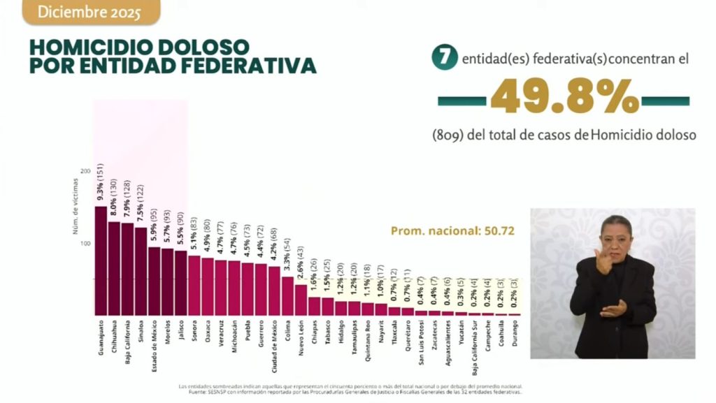 En el acumulado anual de enero a diciembre del 2025, la entidad se ubicó en el sexto lugar nacional, con 1,312 homicidios dolosos, lo que representa el 5.4 por ciento del total nacional. Mientras que, en el reporte específico de diciembre, Guerrero concentró solo el 4.4 por ciento de los homicidios, cerrando el año con 72 homicidios, ubicando al estado en la posición 13 a nivel nacional.