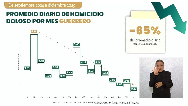 De acuerdo con el informe presentado, esta cifra representa el nivel más bajo desde 2014, además de confirmar una tendencia sostenida a la baja en materia de seguridad. También destacó que Guerrero registró una reducción del 65 por ciento en el promedio diario de homicidios en comparación con octubre de 2024, uno de los descensos más importantes a nivel nacional.