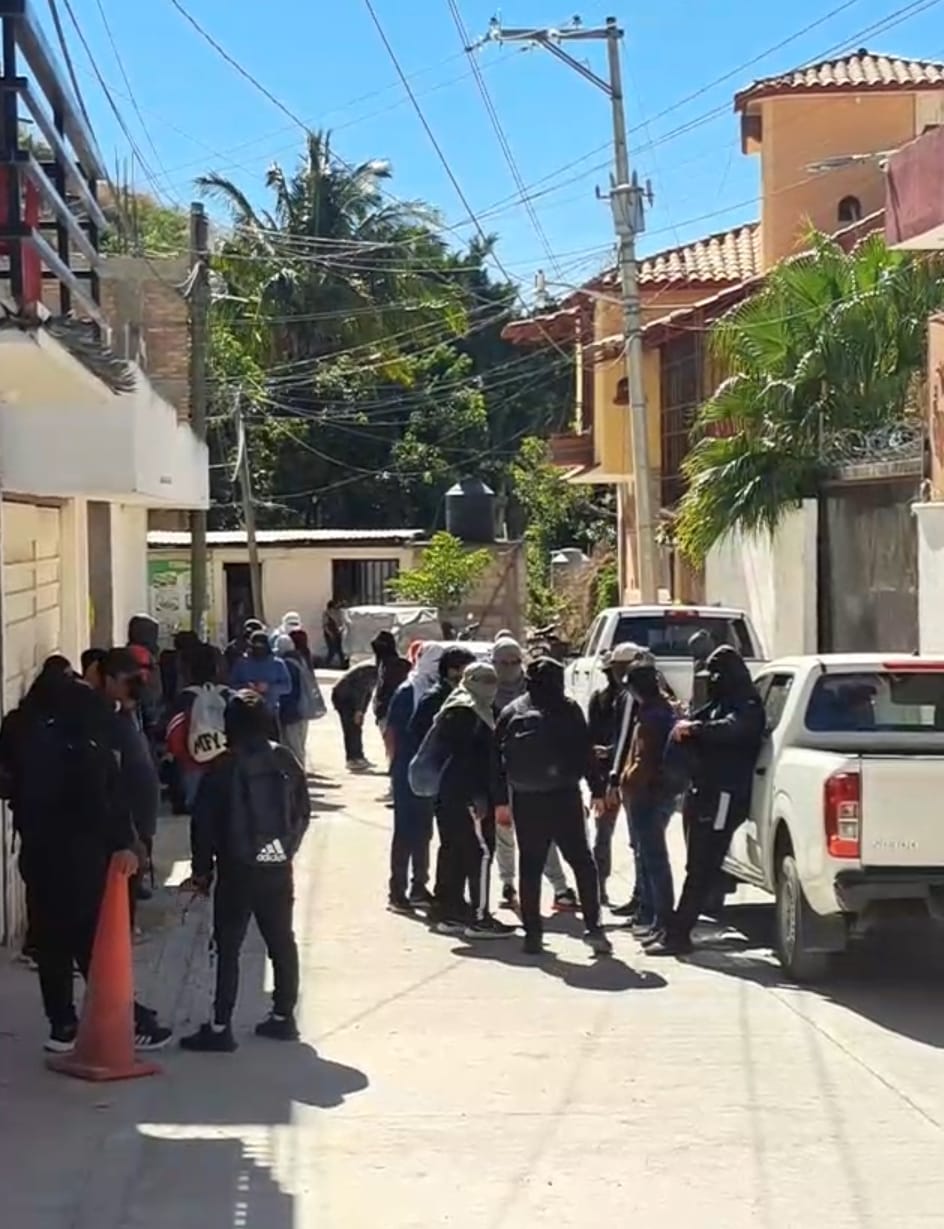 Los normalistas llegaron a bordo de dos autobuses y tres camionetas, las cuales fueron colocadas frente a los accesos del inmueble para bloquear la entrada, mientras que el personal fue desalojado. Mientras los jóvenes permanecieron en el exterior con el rostro cubierto.