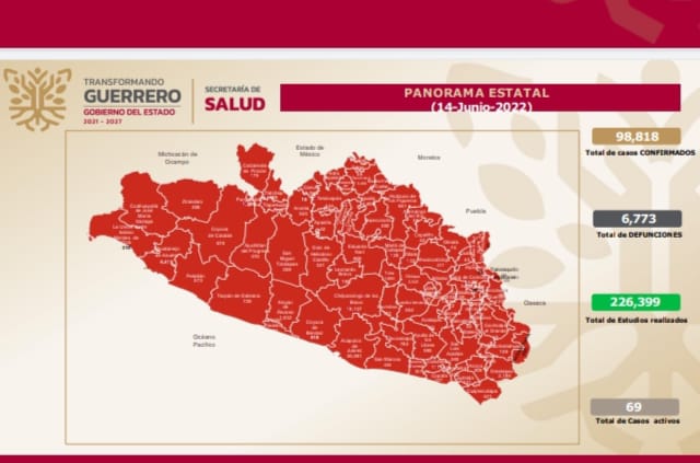 Destacó que desde el inicio de la pandemia, en Guerrero se acumulan 98,818 casos confirmados y 6,773 defunciones, y que los 69 casos activos se concentran en los 11 municipios de Acapulco, con 39; Chilpancingo, 13; Zihuatanejo, 7; Iguala, 3, y Ahuacuotzingo, Arcelia, Atenango del Río, Benito Juárez (San Jerónimo), Taxco, Teloloapan y Tixtla, con 1 cada uno, aportando una ocupación de camas Covid del 4 por ciento.