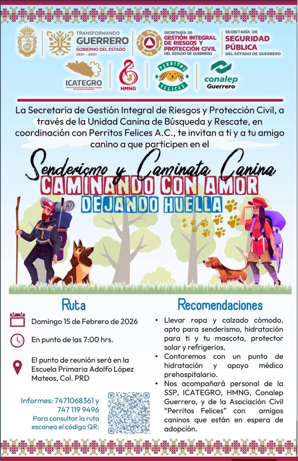 Chilpancingo, Gro., 10 de febrero de 2026 —La Secretaría de Gestión Integral de Riesgos y Protección Civil Guerrero (SGIRPCGRO) invitó a la ciudadanía a participar en el evento de senderismo y caminata canina “Caminando con amor dejando huella”, que se llevará a cabo el 15 de febrero de 2026, a las 7:00 horas, con punto de reunión en la Escuela Primaria Adolfo López Mateos, ubicada en la colonia PRD de Chilpancingo.