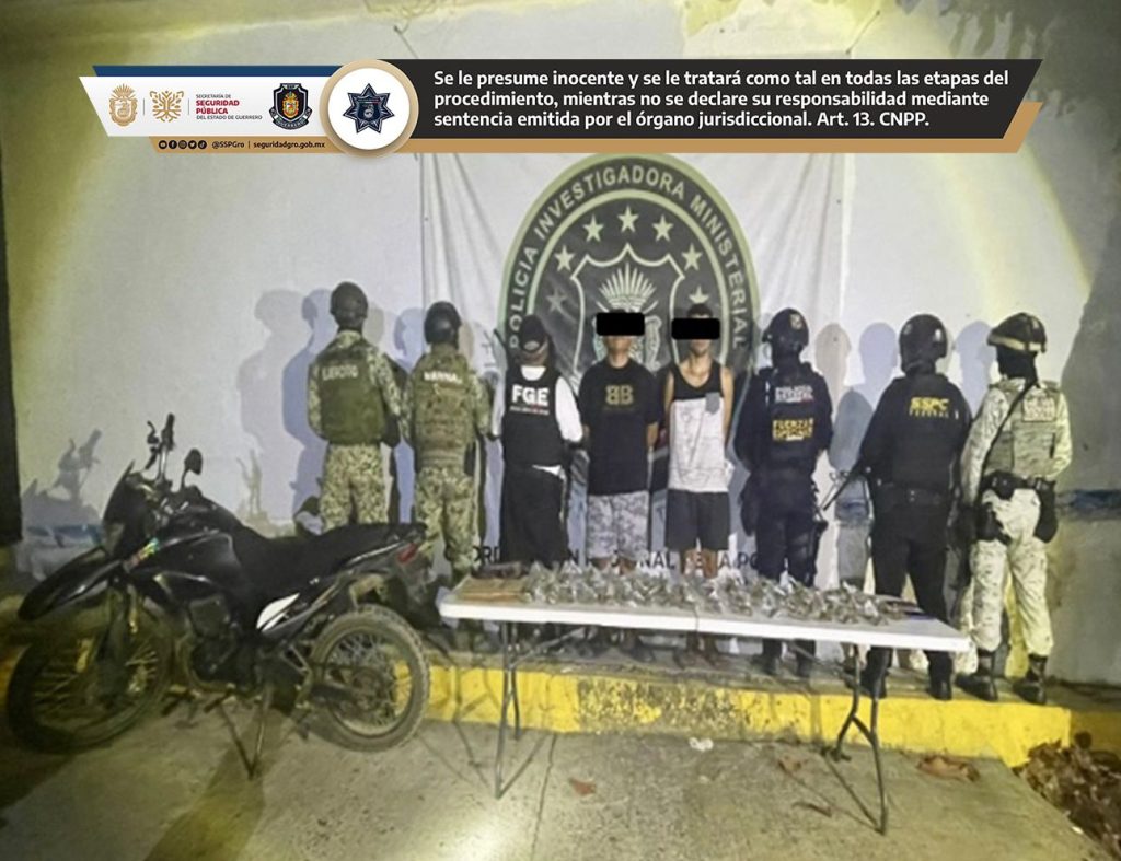 Acapulco, Gro., 11 de febrero de 2026. En acciones operativas interinstitucionales y como parte de los recorridos de prevención en la colonia Mártires de Cuilapan, elementos de la Policía Estatal, Fiscalía General del Estado, Ejército Mexicano, Marina, Guardia Nacional y Secretaría de Seguridad y Protección Ciudadana lograron la detención de dos personas.