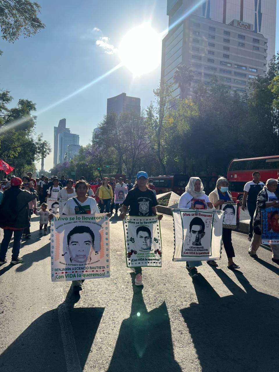 Durante el mitin en el animonumento por los 43, los inconformes pidieron al gobierno federal la presentación con vida de los estudiantes y que personas señaladas en el caso, como el secretario de Seguridad y Protección Ciudadana, Omar García Harfuch y el expresidente Enrique Peña Nieto sean investigados.