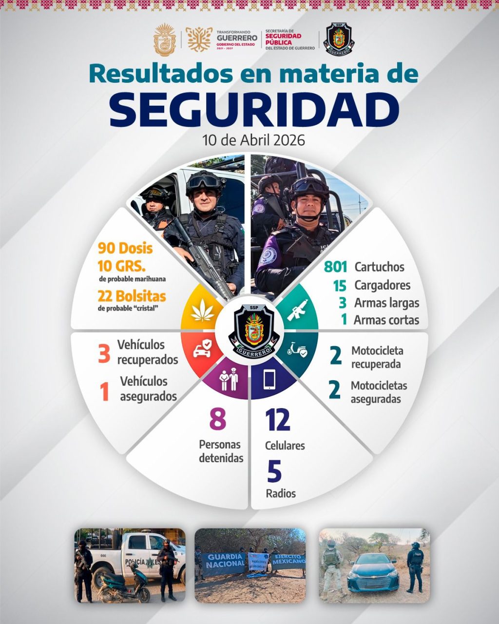 Chilpancingo, Gro., 11 de abril del 2026.– Como resultado de las acciones operativas y de prevención implementadas por la Secretaría de Seguridad Pública del Estado de Guerrero, en coordinación con el Ejército Mexicano, la Guardia Nacional, la Secretaría de Marina, la Secretaría de Seguridad y Protección Ciudadana y la Fiscalía General del Estado, se obtuvieron diversos resultados en materia de seguridad durante la presente jornada.
