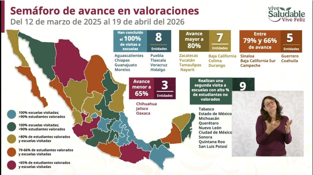 De acuerdo con el reporte, el estado de Guerrero se ubica entre las entidades con avances significativos, al registrar un cumplimiento de entre el 66 y el 79 por ciento en las visitas programadas a planteles escolares, así como en la valoración integral de alumnas y alumnos.
