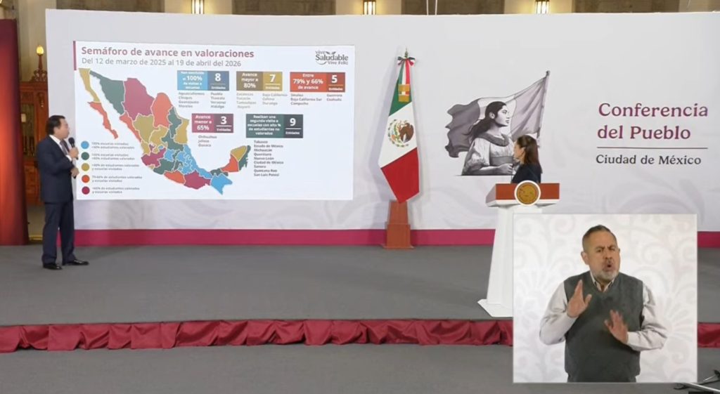 Chilpancingo, Gro., 21 de abril de 2026.– Durante la conferencia matutina de este lunes, encabezada por la presidenta Claudia Sheinbaum Pardo, el secretario de Educación Pública, Mario Delgado Carrillo, presentó el informe de avances del programa “Vive Saludable, Vive Feliz”, destacando el progreso en la cobertura nacional de valoraciones a estudiantes realizadas del 12 de marzo de 2025 al 19 de abril de 2026.