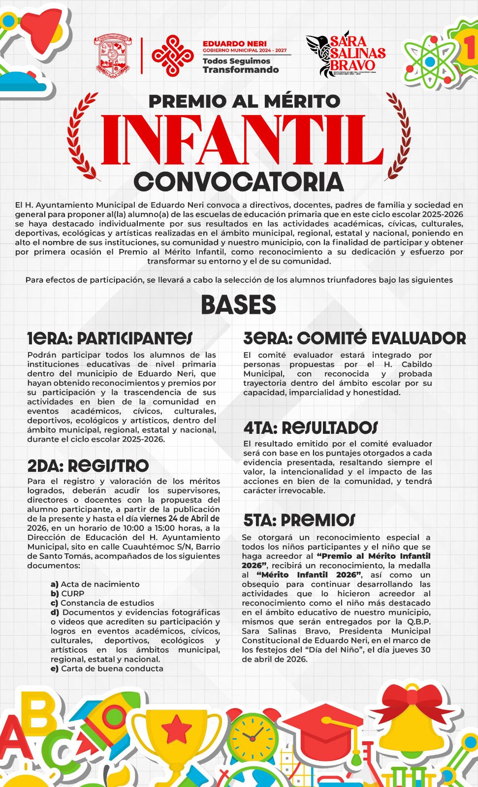 El H. Ayuntamiento Municipal de Eduardo Neri, que preside la Q.B.P. Sara Salinas Bravo, convoca a directivos, docentes, padres de familia y sociedad en general para proponer al(la) alumno(a) de las escuelas de educación primaria que en este ciclo escolar 2025-2026, al