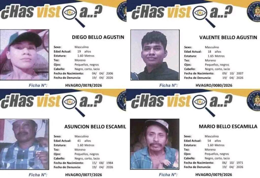 Este miércoles se cumplen cinco días de la desaparición de Asunción Bello Escamilla de 41 años; Diego Bello Agustín de 19 años; Valente Bello Agustín de 18 años; Mario Bello Escamilla de 57 años; Sebastián Riquelme Escamilla de 23 años; Cristóbal Pineda de 40 años y Eriberto Pineda de 38 años.