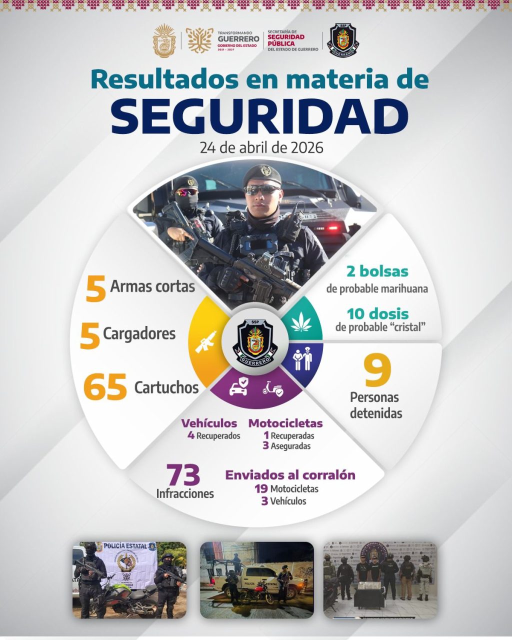 Chilpancingo, Gro., 25 de abril de 2026. La Secretaría de Seguridad Pública del Estado de Guerrero informa que, como resultado de las acciones operativas implementadas en coordinación con autoridades de los tres órdenes de gobierno, durante la presente jornada se obtuvieron resultados relevantes en materia de seguridad en distintas regiones de la entidad.
