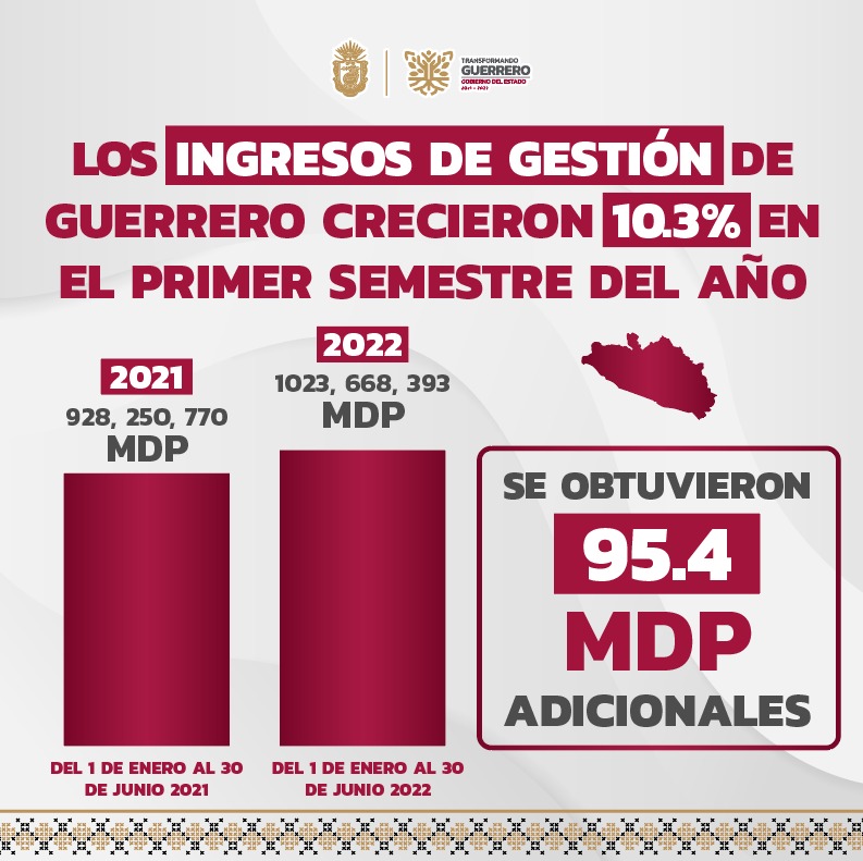 Chilpancingo, Gro., 20 de julio del 2022. – La Secretaría de Finanzas y Administración del Estado, informó que los ingresos propios de gestión de impuestos y pagos de derechos crecieron en un 10.3 por ciento durante el primer semestre de este 2022 en comparación con el mismo periodo del año pasado, lo que representa un adicional de 95.4 millones de pesos en las finanzas públicas de la entidad, resultado de las medidas de combate a la corrupción en la recaudación pública del Estado implementadas por el Gobierno de Evelyn Salgado Pineda.