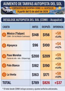 ¡Aumentan tarifas en la Autopista del Sol! Anuncia Capufe nuevos costos Noticias ¡Aumentan tarifas en la Autopista del Sol! Anuncia Capufe nuevos costos DANIEL GENCHI PALMA 14 abril, 2026 De acuerdo con el documento oficial de tarifas vigentes 2026, el incremento entró en vigor a las...Leer Más..