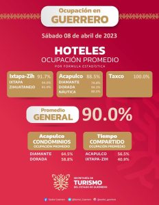 Alcanza un promedio general del 90 por ciento, la ocupación hotelera, en los destinos turísticos del estado de Guerrero. Noticias Alcanza un promedio general del 90 por ciento, la ocupación hotelera, en los destinos turísticos del estado de Guerrero. DANIEL GENCHI PALMA 9 abril, 2023 La secretaria de turismo reportó que la ocupación promedio por formula estadística es la siguiente:...Leer Más..